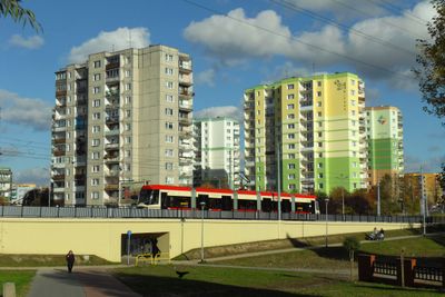 De kerk van Sint-Urszula Ledóchowska is een ontmoetingsplek waar bewoners samenkomen voor religieuze en gemeenschapactiviteiten. Deze ruimtes vormen het sociale leven van de wijk.
