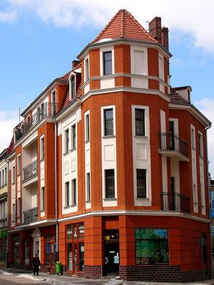 Het gebouw aan de Krakowska-straat is een drie verdiepingen tellende structuur met decoratieve vensterdrempels, karakteristieke hoektorenelementen en een mansardedak bedekt met keramische tegels. Het hoeksectie verbindt de zijgevels door een torenachtig element dat wordt bekroond door een lage keramische kroon.