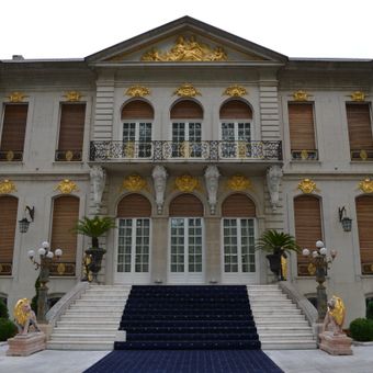 Het Manu-Auschnitt Huis toont architectonische elementen geïnspireerd door het Biron Paleis in Parijs, met gedetailleerde gevelornamenten.