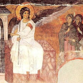 De Witte Engel fresco toont een engel in witte gewaden zittend op een steen, wijzend naar het lege graf van Christus voor de mirredraagsters.
