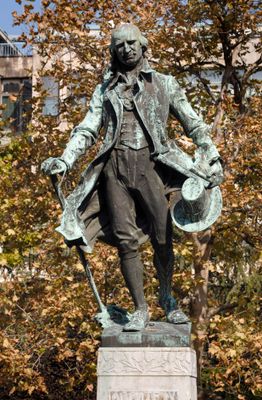 Het Monument voor Dositej Obradović staat in het Academiepark en toont een levensgroot figuur met boeken en een pen terwijl hij voorwaarts stapt.