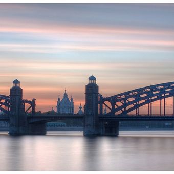 De Bolsjeochtinskiy-brug strekt zich 334,8 meter uit over de Neva met drie overspanningen en vier Normandische granieten torens.