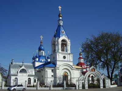 De Kerk van de Bescherming van de Theotokos is een stenen gebouw met een witte gevel die elementen van Russische Revivalarchitectuur toont. De klokkentoren en buitendecoraties volgen traditionele orthodoxe patronen en vormen.
