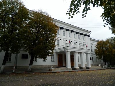 Het Adellijke Vergaderingsgebouw vertoont klassieke Russische architectuur met symmetrisch ontwerp, witte zuilen en traditionele ornamentale details op de gevel.