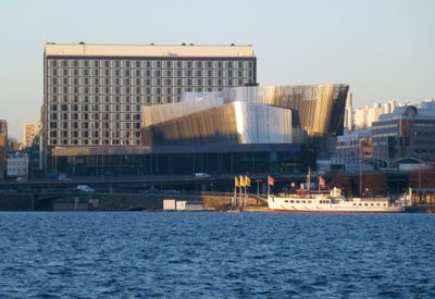 Het Stockholm Waterfront gebouw rijst op langs het water, met glazen gevels die het water van het Mälarmeer en het stadsbeeld weerspiegelen.