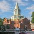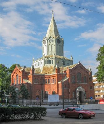 De rode bakstenen kerk heeft een grote centrale toren met een mintgroen metalen dak bekroond door een Grieks kruis en meerdere puntige torens.