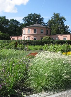 De openbare tuin strekt zich uit over meerdere hectaren met fruitbomen, kassen, rozentuinen en een wijngaard met zeven druivensoorten nabij de orangerie.