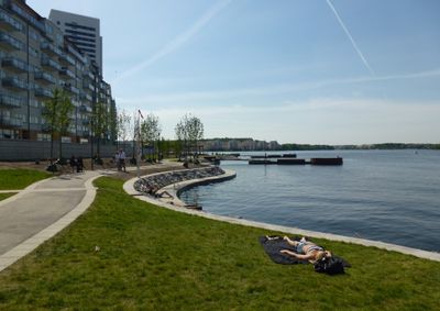 Het district combineert moderne Zweedse architectuurelementen met grote glazen gevels en balkons met uitzicht op het water.