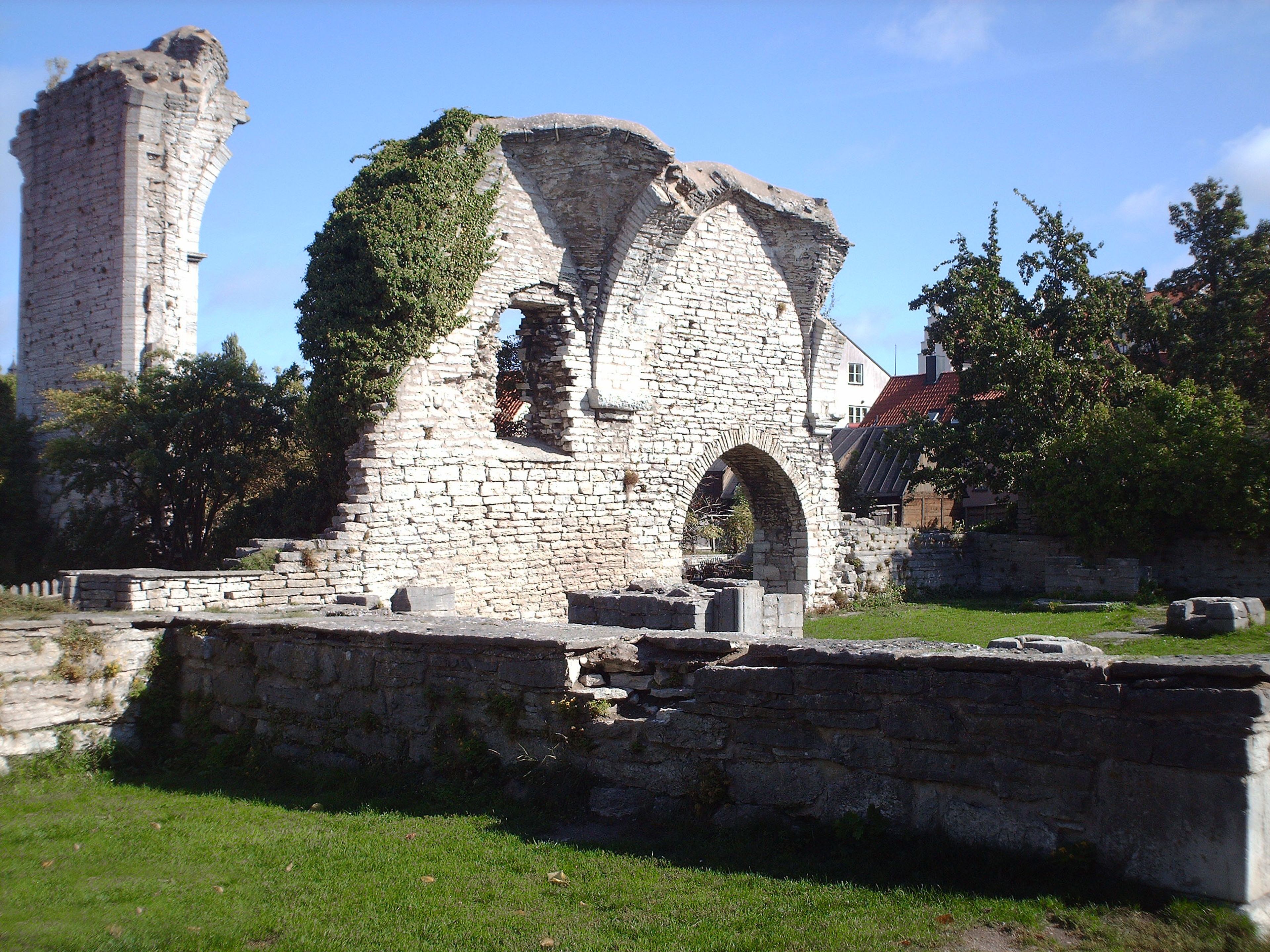 De overblijfselen van twee verbonden middeleeuwse kerken staan in het centrum van Visby, met stenen muren uit de 13e eeuw.