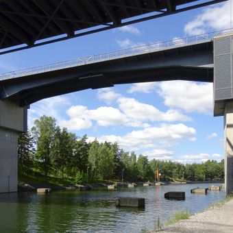 De Saltsjöbron-brug overspant het Södertälje-kanaal met mechanische systemen die het wegdek optillen voor de doorgang van maritieme vaartuigen.