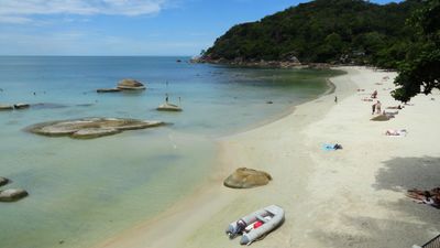 Silver Beach is een zandstrand in Lamai, Koh Samui, met licht gekleurde zand en kalm water dat geschikt is voor zwemmen. De kustlijn strekt zich uit met minimale ontwikkeling in de directe omgeving, wat een open en ontspannen omgeving creëert.