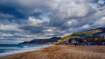 Het strand ligt nabij het kasteel van Alanya en verbindt modern strandleven met Turks kusterfgoed door markten en restaurants.