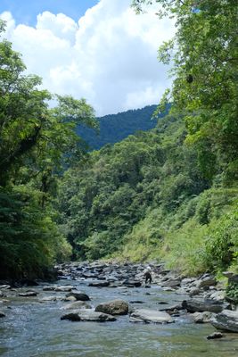 Het water van de Ayu Beek stroomt door dichte vegetatie en vormt een natuurlijke habitat voor talrijke vissoorten en waterplanten.