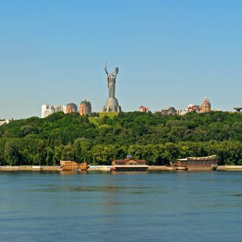 Het Moeder Oekraïne Monument rijst 62 meter op met een vrouwelijke figuur die een zwaard en schild vasthoudt boven de hoofdstad.