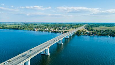 De Antonivka-verkeersbrug is een betonnen oversteek over de Dnipro bij Cherson, die zich uitstrekt over ongeveer 1,4 kilometer en rust op meer dan dertig pijlers. Smalle voetpaden lopen langs beide zijden, waardoor mensen te voet kunnen oversteken terwijl ze het wijde uitzicht over de rivier beneden bekijken.