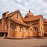 De kathedraal heeft een rode bakstenen constructie met een grote koepel en glas-in-loodramen gepositioneerd op een heuvel met uitzicht over centraal Kampala.