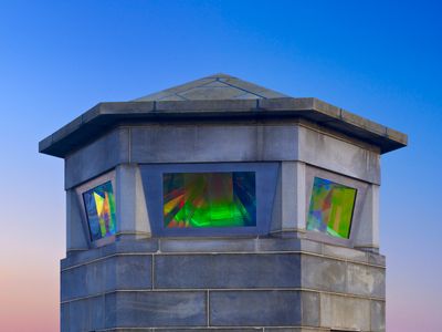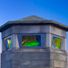 Het Brugwachtershuisje bevat zes ramen met caleidoscopische kegels gemaakt van dichroïsch acryl die reflecterende kleurpatronen creëren.