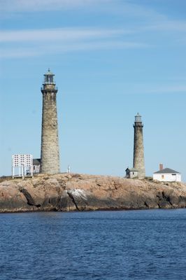Het Cape Ann vuurtoren station heeft twee granieten torens van 38 meter hoog, geplaatst op Thacher Island voor de kust van Massachusetts.