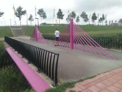 De brug verbindt woonwijken in Spijkenisse en biedt voetgangers en fietsers een oversteek over parallelle grachten in de wijk Het Land.