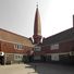 Het rode bakstenen gebouwencomplex heeft gebogen muren, torenachtige elementen en sierlijke details in het architectonische ontwerp.