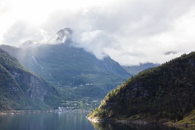 Geirangerfjord is een fjord in de gemeente Stranda die zich 15 kilometer uitstrekt tussen steile bergwanden en gevoed wordt door talrijke watervallen. Het water bereikt een diepte van 260 meter, en de omliggende toppen rijzen ver daarboven uit.