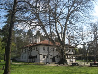 Een 170 jaar oude plataan staat voor het gebouw, naast een ronde steen die Prins Miloš gebruikte om op zijn paard te klimmen.